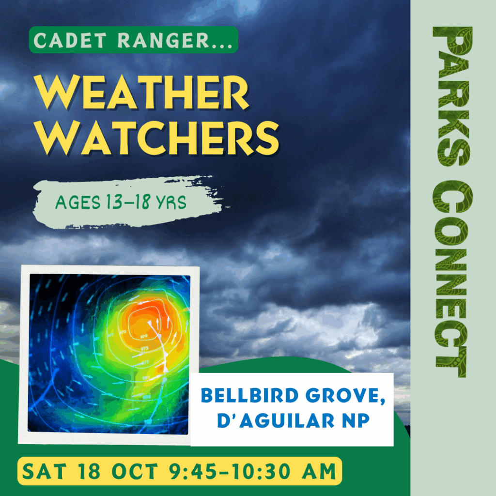 Our Roaming Cadet Rangers (ages 13–18) will learn why keeping an eye on the sky is so crucial for Rangers, how microclimates affect the day-to-day temperature and conditions in some of Queensland’s favourite parks, and how weather can determine a Ranger’s daily tasks.