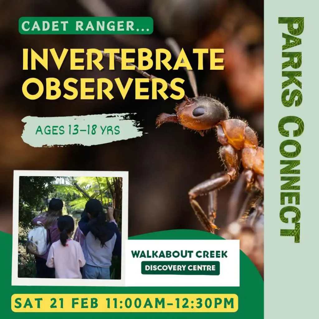 Cadet Rangers (aged 13–18 years) will take a guided walk exploring the diversity of invertebrates found within the park. As insects or spiders are encountered, the presenter will point out key species and discuss their ecology, biology and the roles they play within ecosystems.